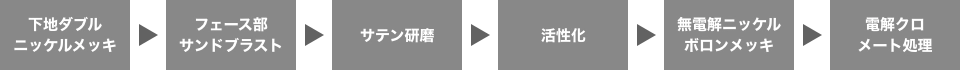 サテン研磨やサンドブラストを行い、空中放置され時間が経ったニッケル表面に他のメッキを積層し密着させることは非常に困難でありますが、脱脂や酸活性を研究し可能としました。こうした基礎技術がその後のアーメット鋼やチタン合金など難素材へのメッキ処理の足掛かりになっていると思われます。